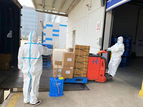3月28日起,除关键岗位外,基层员工开始轮流值班,物流中心人力极度短缺,进出库货物消杀、装卸、查验等一系列工作量堆积如山。物流中心姜广德经理全面协调人力,带领胡殿钊、钱伟、汪洋、张宾、薛鹏等部门核心人员加急处理订单,确保酒精、口罩、消毒液、防护服等医疗物资有条不紊进出库,保障抗疫物资充足供应。